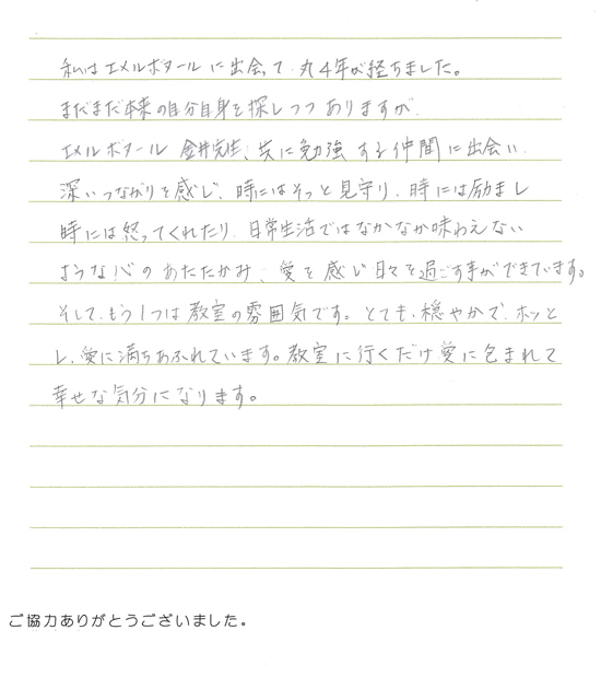 私は、エメルボヌールに出会ってから、自分の良いところに気づくことができました。